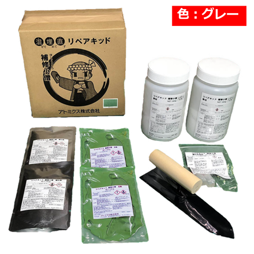 コンクリート床の欠損部の補修用。・骨材に主剤、硬化剤、硬化促進剤を投入し容器を逆さまにして樹脂を絡ませ、色が均一になるまで良く振って混合し、付属のコテを使用しコンクリート床の欠損部の補修に。