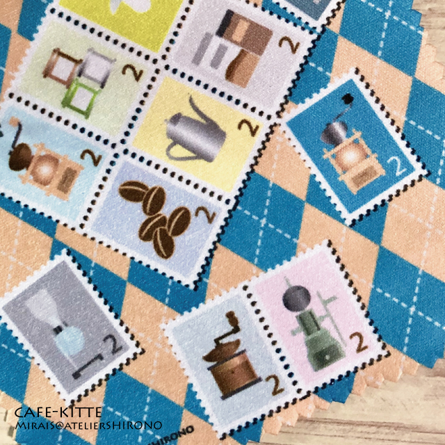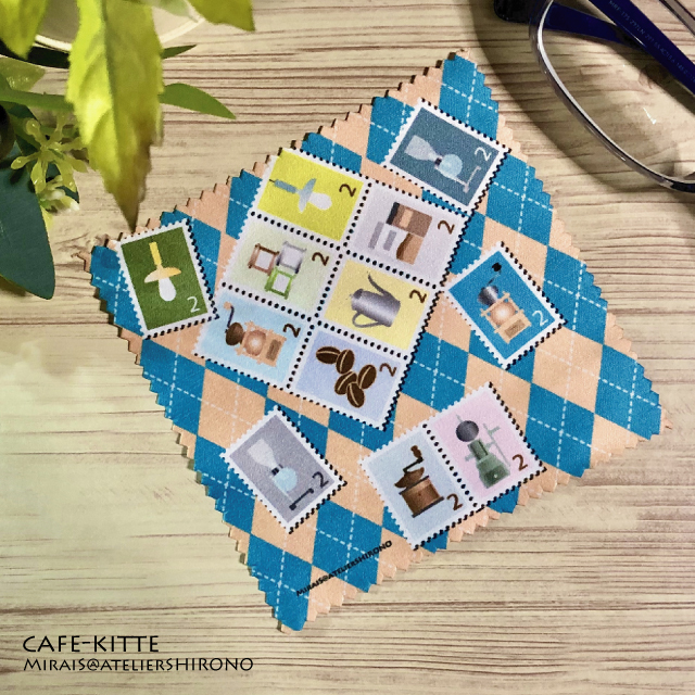 近所の喫茶店にあるコーヒーアイテムを基にしたイラストを切手柄にしたメガネ拭きです。コーヒーミル、ポット、粉、豆、サイフォン、そしてアンティークな電灯。おとなカワいい?イラストに仕上げました。