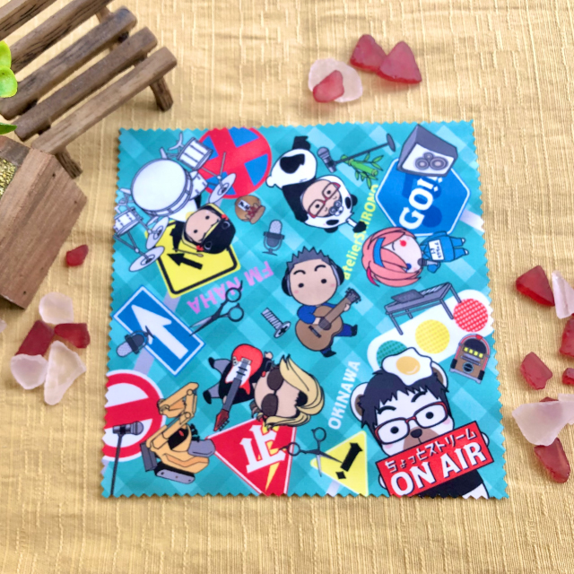 エフエム那覇・ツイキャス番組「ちょっとストリーム」のナビゲーターたちをアトリエしろのが可愛くキャラクター化したイラストをプリントした眼鏡拭きです。