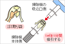 付属のゴミ取り袋を掃除機の柄ジョイント部にセットして、中程度の吸引力で1m²の範囲を1分間吸引します。