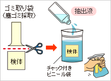 ・抽出液にゴミ取り袋を浸し、1分間しっかり揉んでアレルゲンを抽出します。