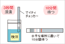 ・アルミラミネート袋を開封し、マイティチェッカーを抽出した液にDIPラインまで3秒間浸します。※同封の乾燥剤は、検査には用いません。