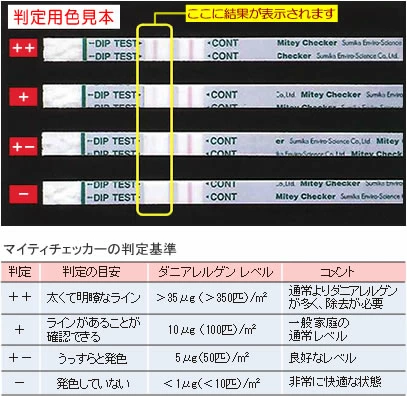 アレルギー性疾患の症状改善には、患者をアレルゲンから遠ざけることが最も有効な手段であり、そのためにはまず、患者宅のどこにどれくらいのダニアレルゲンがあるのかを知る必要があります。その検出手段として、マイティーチェッカーは有効で、客観的なデータを得ることができます。