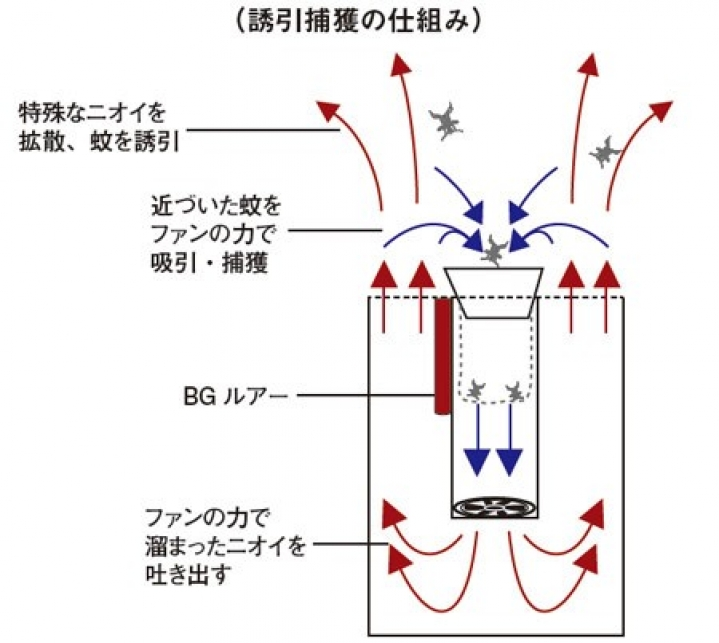 そのメカニズムは、人の汗の匂いに似せた誘引剤(BGルアー)匂いを拡散し、蚊の成虫をおびき寄せ、本体に近づいた蚊をファンの力でネットの中に吸引し、捕獲します。