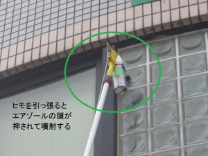 本体にエアゾールやプッシュ式のスプレーを取りつけ紐をひっぱるだけで高所での噴霧作業が可能になります。
