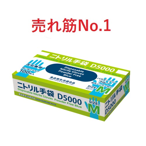 ニトリル手袋(D5000) Mサイズ 青 粉無 厚80マイクロメートル(1ケース20箱)
