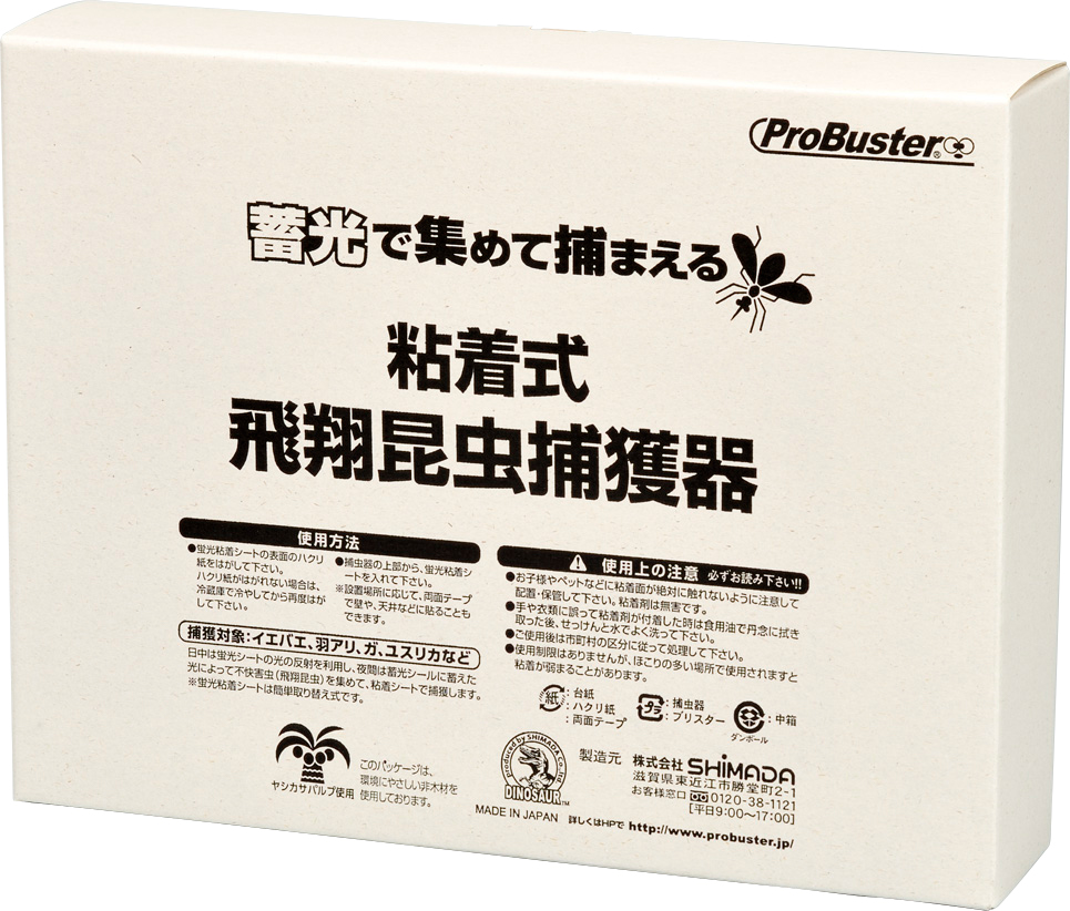 ・蓄光シールで飛翔昆虫を誘引し、蛍光粘着シートで捕獲する飛翔昆虫用捕獲器です。