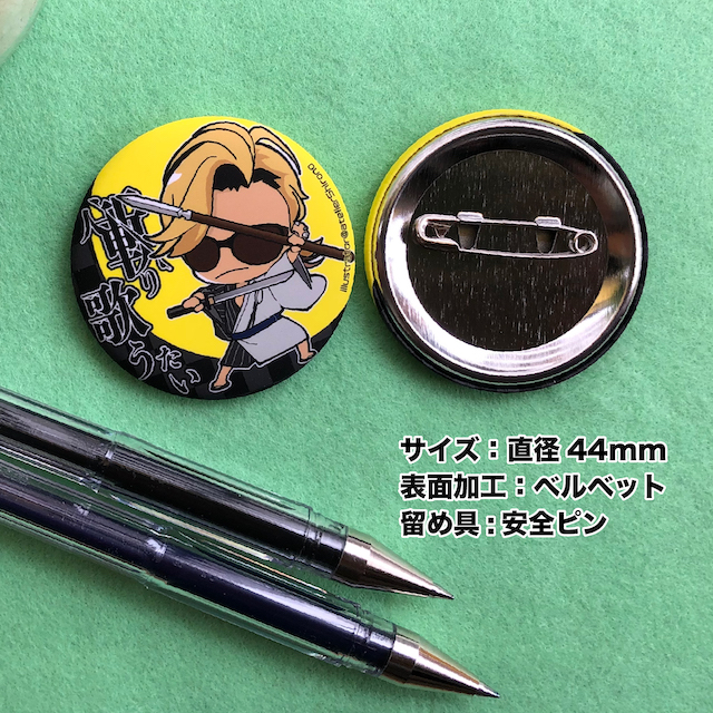 缶バッジ表面を強く引っ掻いたり圧力をかけるとイラストが剥がれたり破損の恐れがありますのでご注意ください。